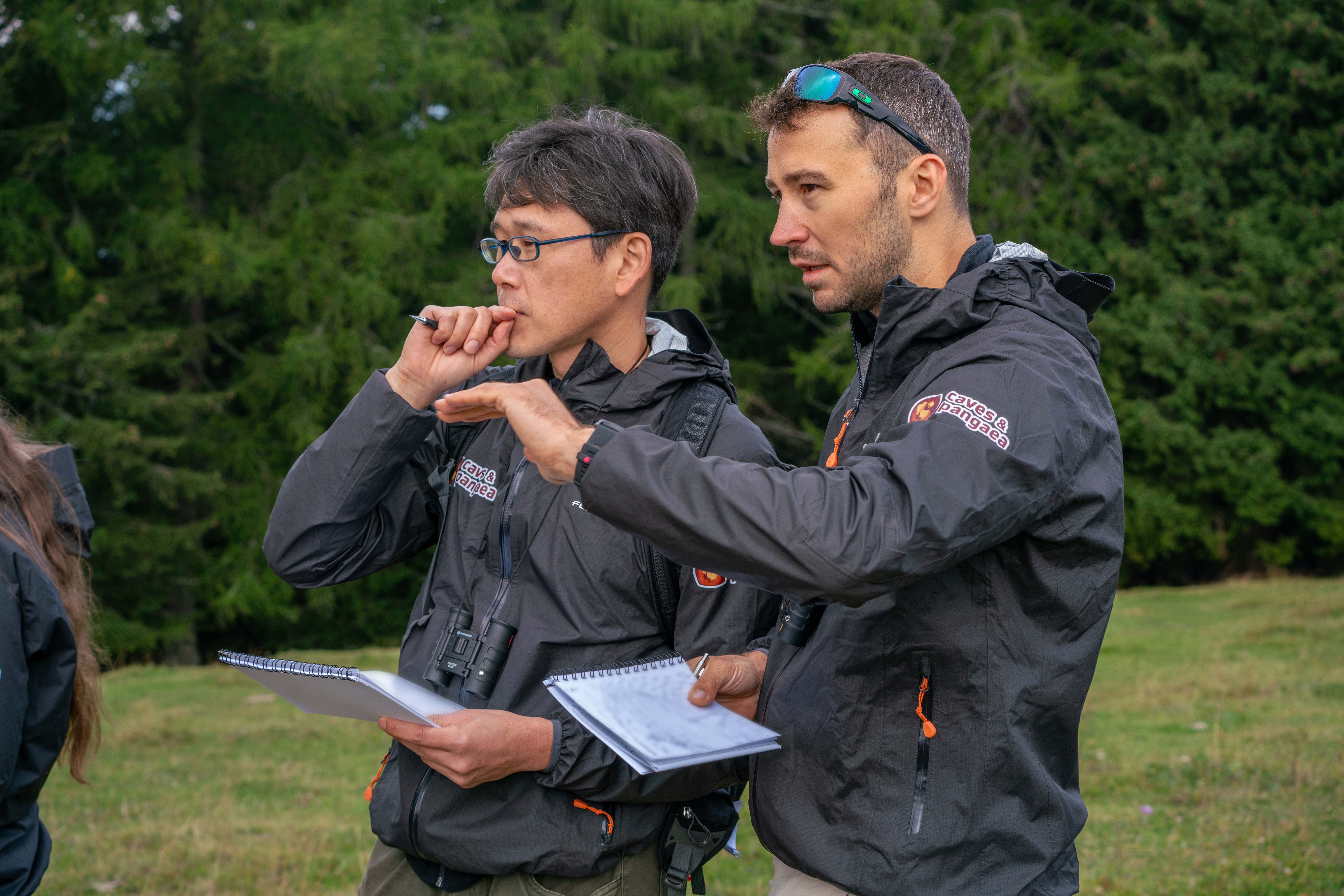 パンゲア(PANGAEA)訓練にて、景観に存在する複雑な地質学的特徴について意見を交換する金井宣茂宇宙飛行士ら / 欧州宇宙機関(ESA)が実施するパンゲア(Planetary ANalogue Geological and Astrobiological Exercise for Astronauts: PANGAEA)訓練 1週目 / イタリア ブレッターバッハ / 撮影日:2024年9月11日(日本時間)
