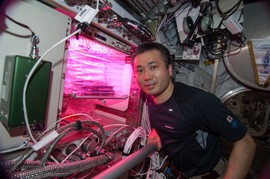 EXPRESSラック3に設置された野菜栽培システム(Veggie)の前で写真撮影する若田宇宙飛行士