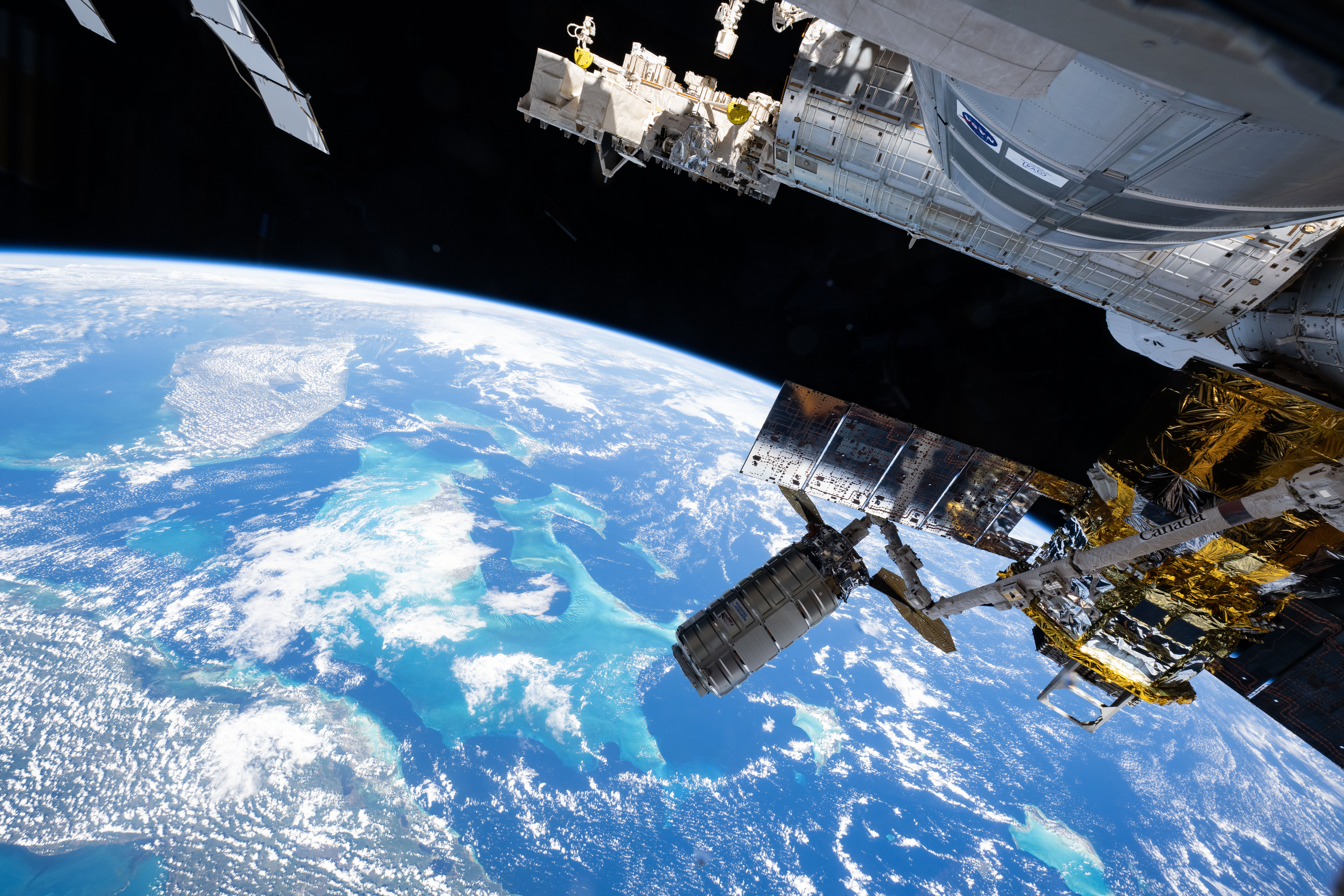 ISSから撮影されたシグナス補給船運用23号機(NG-23)とHTV-X1号機、バハマ諸島上空