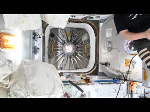 新型宇宙ステーション補給機(HTV-X)1号機のハッチを開ける油井亀美也宇宙飛行士 / 「ハーモニー」(第2結合部) / 撮影日:2025年10月30日(日本時間)