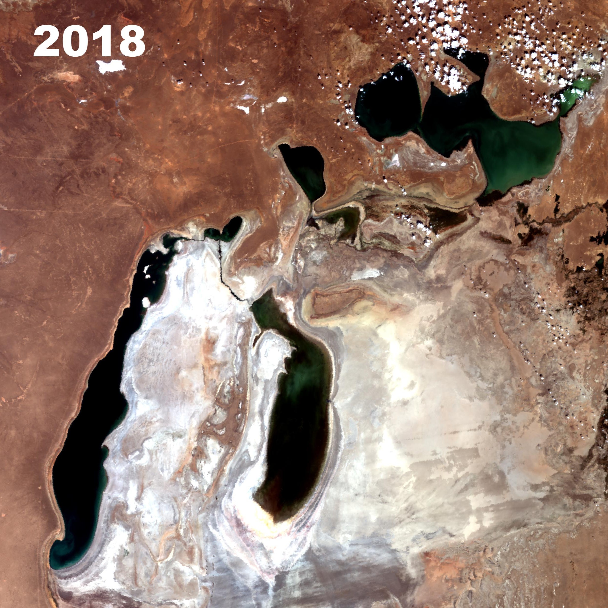 気候変動観測衛星「しきさい(GCOM-C)」が観測したアラル海 かつて世界で4番目の広さを誇った湖「アラル海」。 アラル海はカザフスタンとウズベキスタンにまたがる湖です。1960年代以降、流れ込む川の水が大規模な灌漑に利用されたことで、水量は急激に減少し、現在はかつての10分の1以下にまで縮小しています。 2018年と2025年の衛星画像を比較しても、湖の縮小がはっきりとわかります。 観測日:2018年8月12日 観測地:アラル海 観測衛星:気候変動観測衛星「しきさい(GCOM-C)」