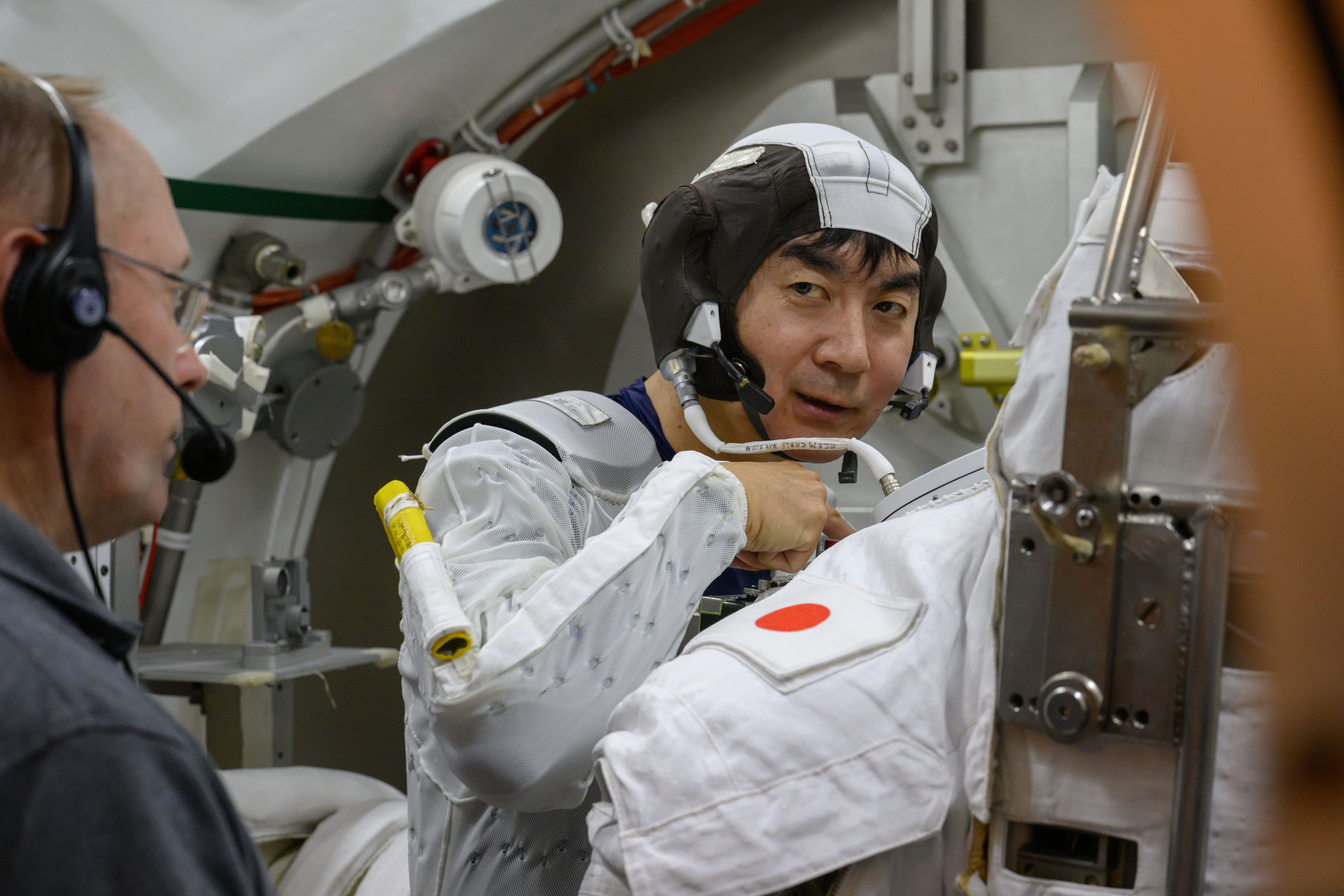 SSATAチャンバにて船外活動(EVA)に関する訓練を行う油井宇宙飛行士