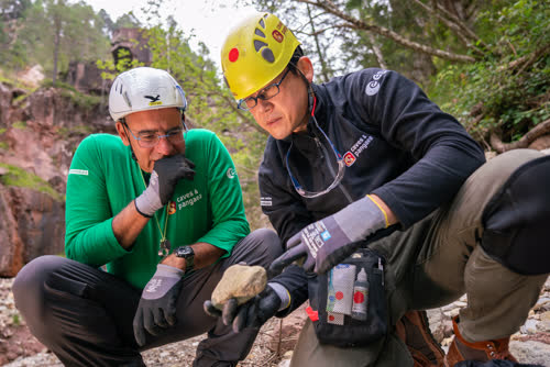パンゲア(PANGAEA)訓練にて、インストラクターと岩石サンプルを観察する金井宣茂宇宙飛行士 / 欧州宇宙機関(ESA)が実施するパンゲア(Planetary ANalogue Geological and Astrobiological Exercise for Astronauts: PANGAEA)訓練 1週目 / イタリア ブレッターバッハ / 撮影日:2024年9月8日(日本時間)