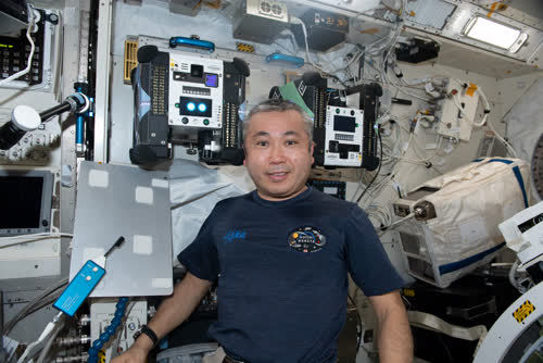 若田光一宇宙飛行士とAstrobee(アストロビー) / 「きぼう」船内実験室(PM) / 撮影日:2023年2月3日(日本時間)(iss068e045345)