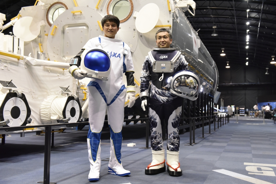 JAXA Astronauts Koichi Wakata and Takuya Onishi pose for a photo after an awards ceremony for JAXA spacesuit design contest at the Tsukuba Space Center. / March 7, 2018