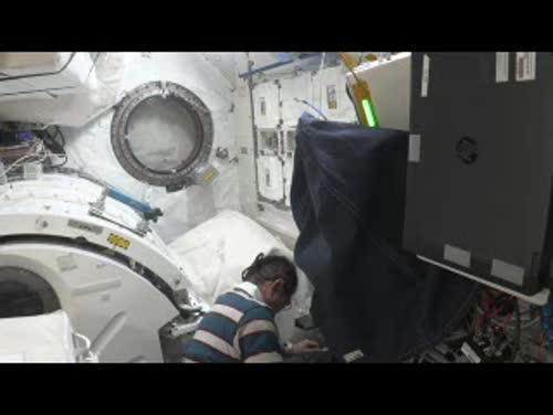 ライブイメージングシステム(COSMIC)の定期点検を行う油井宇宙飛行士