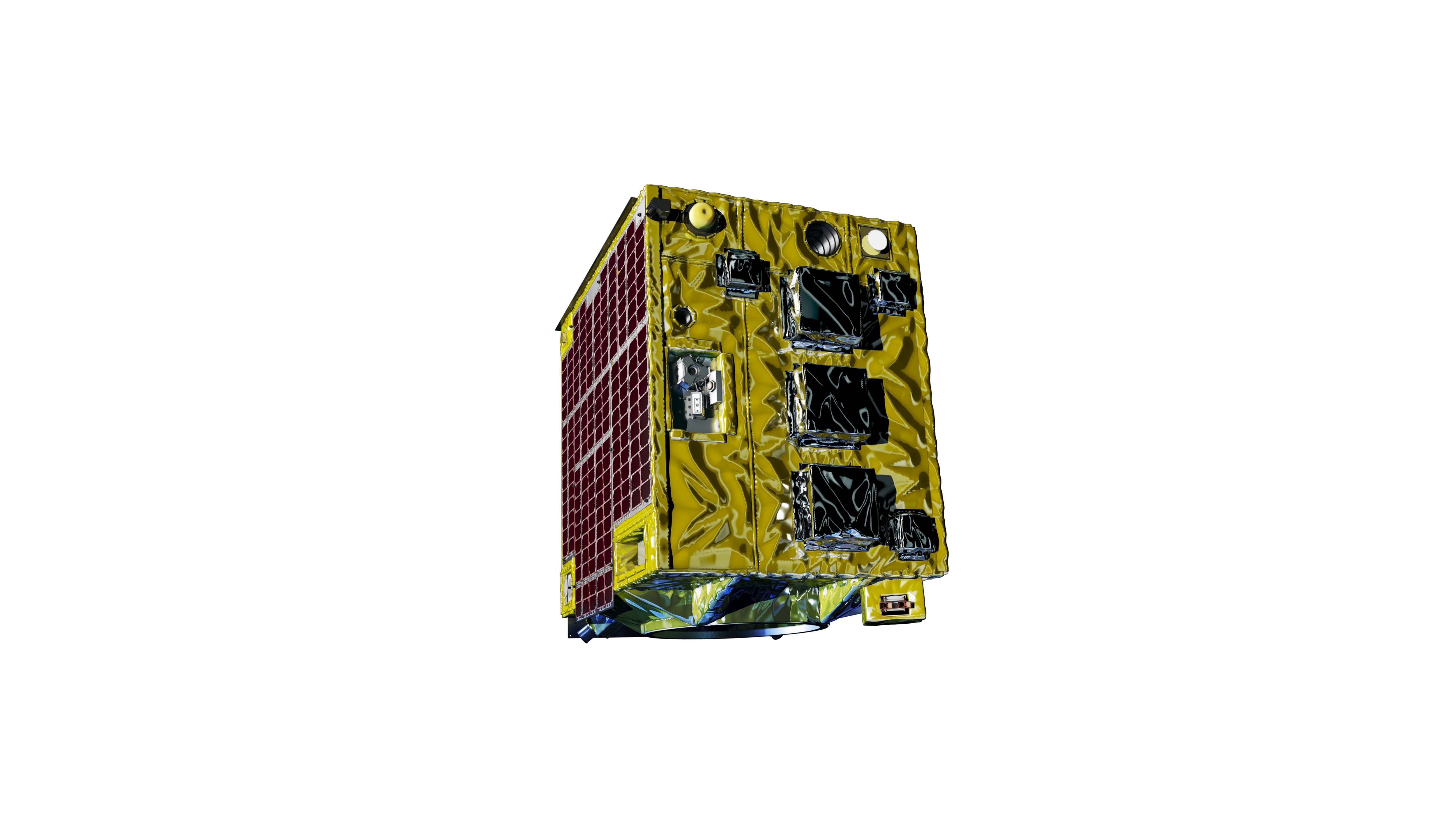 革新的衛星技術実証4号機の小型実証衛星4号機(RAISE-4)。 公募により選定された8つの部品・機器の実証テーマを搭載し、軌道上で実証テーマ機器の実験を行います。 <展開物が展開する前のロケット搭載時の形態>