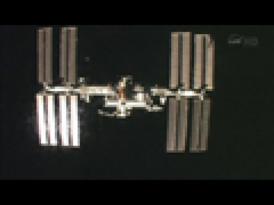 STS-133ディスカバリー号フライアラウンド / フライアラウンドを行うディスカバリー号フライトデッキから見た国際宇宙ステーション(ISS)全景 / 2011年3月7日(米国中部標準時間)