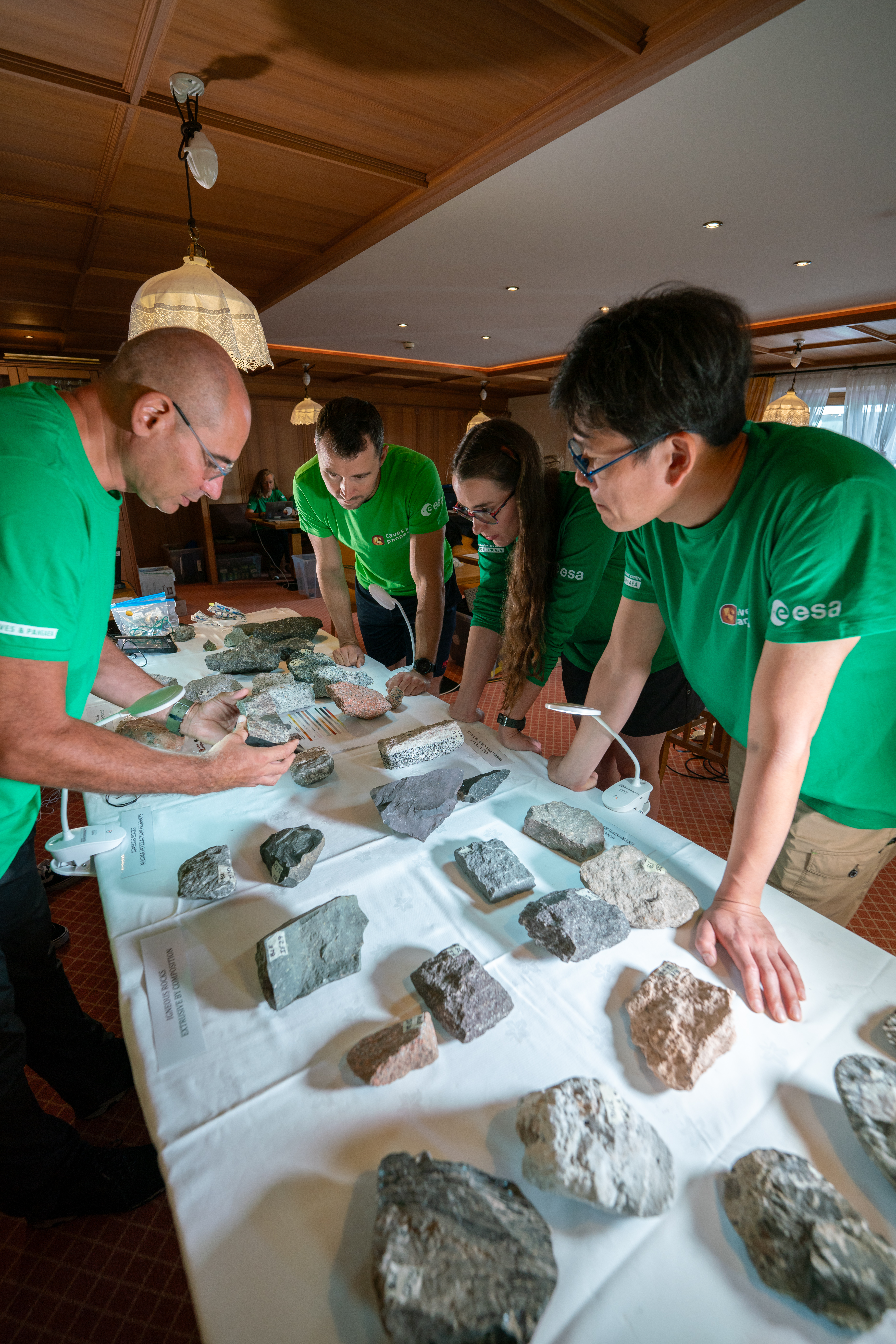 パンゲア(PANGAEA)訓練にて、岩石サンプルについてインストラクターから説明をうける金井宣茂宇宙飛行士ら / 欧州宇宙機関(ESA)が実施するパンゲア(Planetary ANalogue Geological and Astrobiological Exercise for Astronauts: PANGAEA)訓練 1週目 / イタリア ブレッターバッハ / 撮影日:2024年9月9日(日本時間)