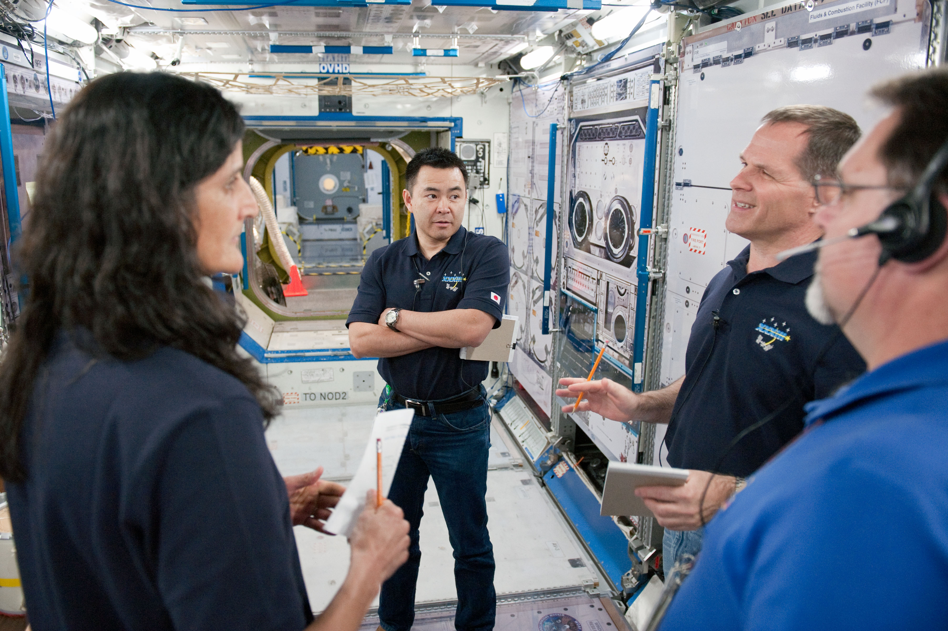 モックアップ(実物大模型)で訓練を行うウィリアムズ、星出、フォード宇宙飛行士 / 国際宇宙ステーション(ISS)のモックアップ(実物大模型)での緊急事態を想定した訓練に参加する、左からサニータ・ウィリアムズ、星出、ケビン・フォード宇宙飛行士。 / NASAジョンソン宇宙センター(JSC) / 2012年1月13日(ライブラリ:jsc2012e018769)