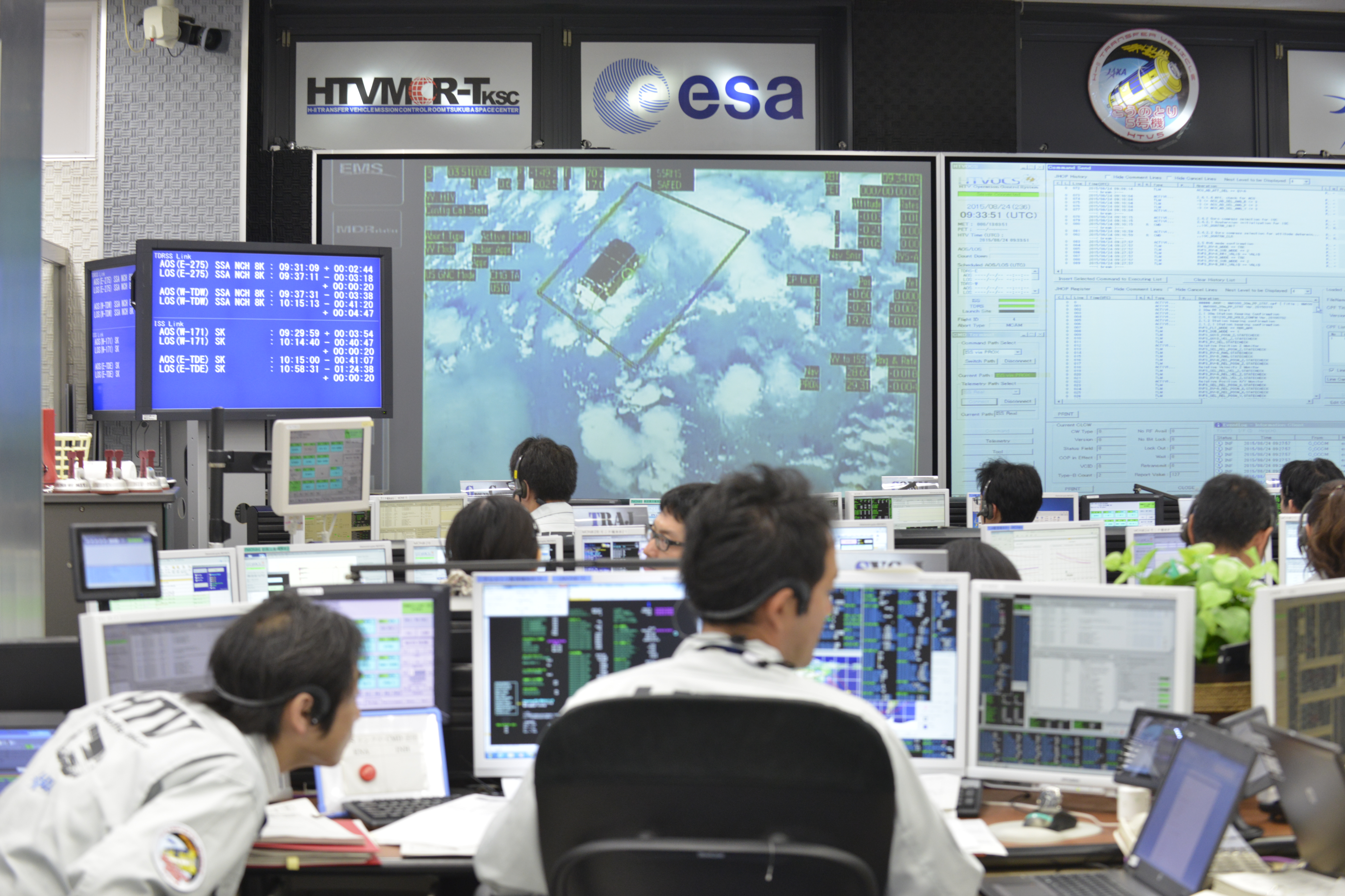 Flight controllers at the HTV Mission Control Room keep their eyes on H-II Transfer Vehicle 5 (KOUNOTORI 5) being grappled by the station's robotic arm (SSRMS). / August 24, 2015