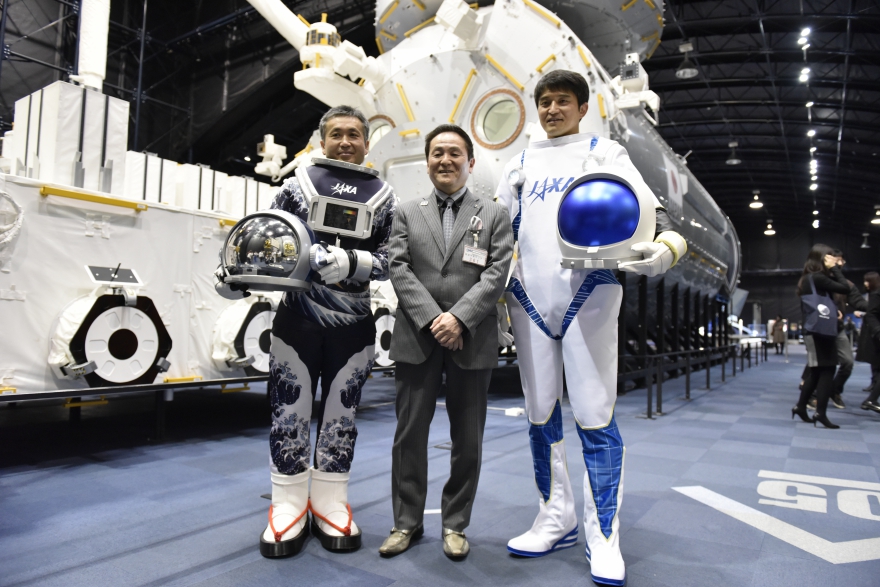 JAXA Astronauts Koichi Wakata and Takuya Onishi pose for a photo with Minoru Aoki, Administrator of MODE GAKUEN after an awards ceremony for JAXA spacesuit design contest at the TKSC. / March 7, 2018