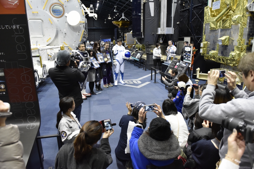 JAXA Astronauts Koichi Wakata and Takuya Onishi pose for a photo with prize winners after an awards ceremony for JAXA spacesuit design contest at the Tsukuba Space Center. / March 7, 2018