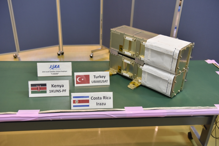 超小型衛星「1KUNS-PF」(ケニア)、「Irazu」(コスタリカ)、「UBAKUSAT」(トルコ)が搭載された「きぼう」の小型衛星放出機構(J-SSOD)衛星搭載ケース