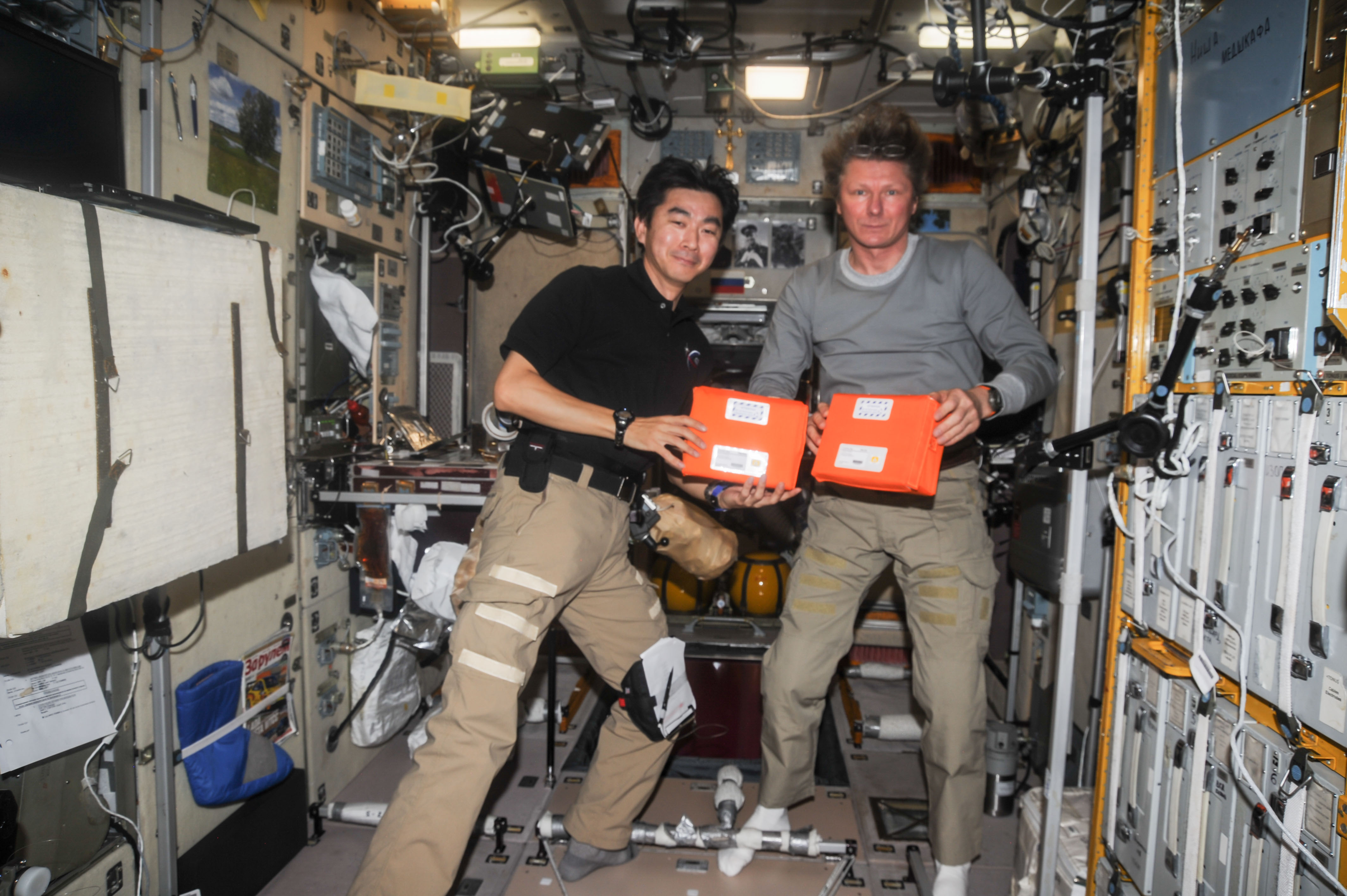 JAXA PCG実験のサンプルが入ったセルユニットの保存バッグを手に写真撮影する油井、パダルカ両宇宙飛行士