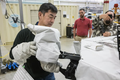 JAXA astronaut Kimiya Yui during Alpha Magnetic Spectrometer-02 (AMS-02) Multi Layer Insulator (MLI) High Fidelity cutting training at NASA's Johnson Space Center. / February 12, 2025 (jsc2025e006642)