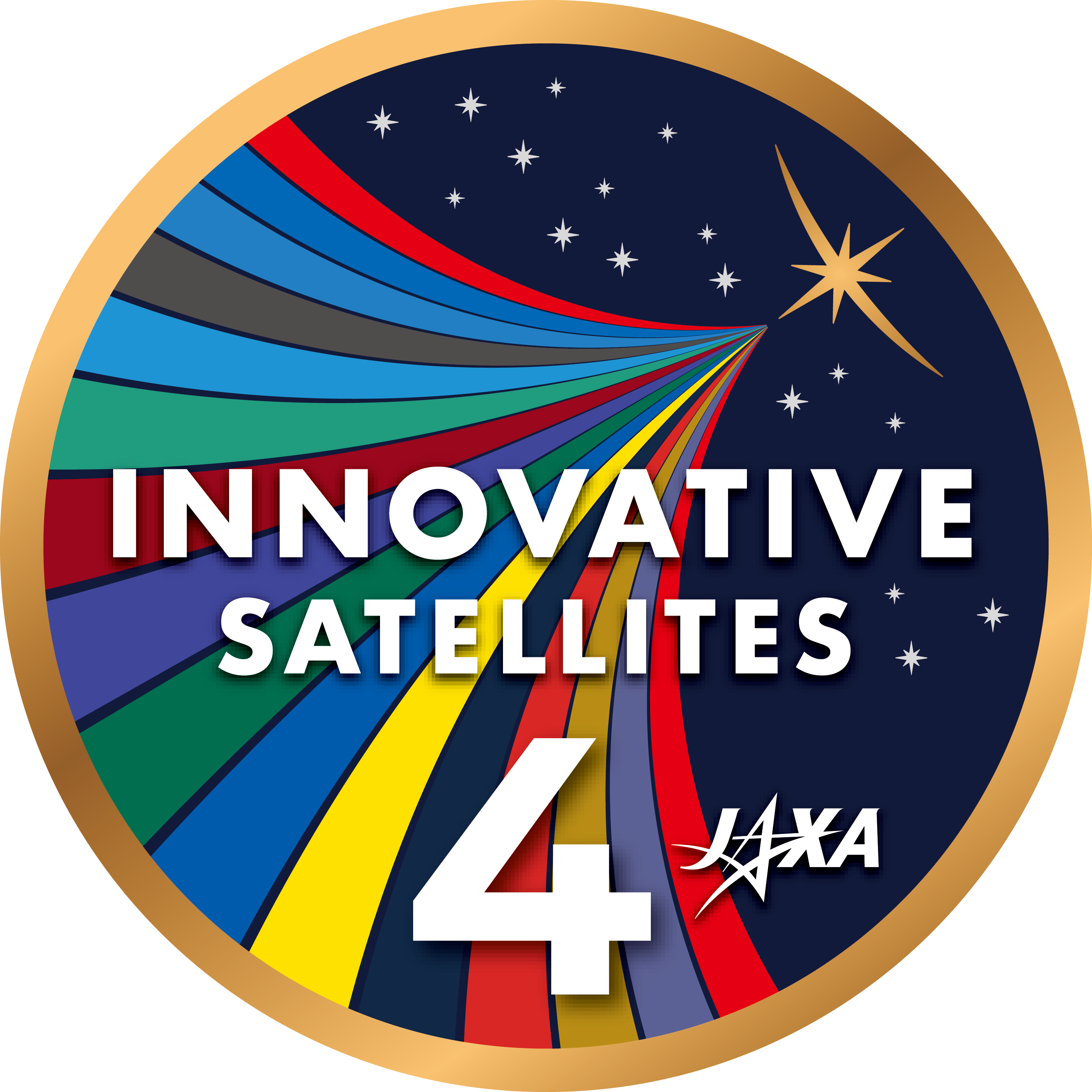 革新的衛星技術実証4号機のシンボルとして、広報活動に使用しています。 16の実証テーマを、各機関をイメージした16色の帯で表しています。 実証テーマ機関の想いとチャレンジが革新的衛星技術実証4号機として一つにまとまり、革新的衛星技術実証3号機の想いをも継承しつつ、未来を目指していくことを表しています。
