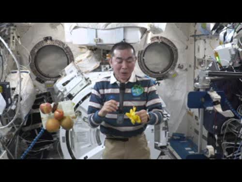 新型宇宙ステーション補給機(HTV-X)1号機で届けられた生鮮食品(りんご、トマト、和梨、温州みかん)を紹介する油井亀美也宇宙飛行士 / 「きぼう」船内実験室(PM) / 本映像は4K(3840×2160)及びHD(1920×1080)で提供が可能 / 取得日:2025年11月5日(日本時間)