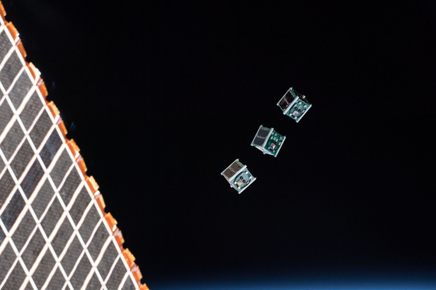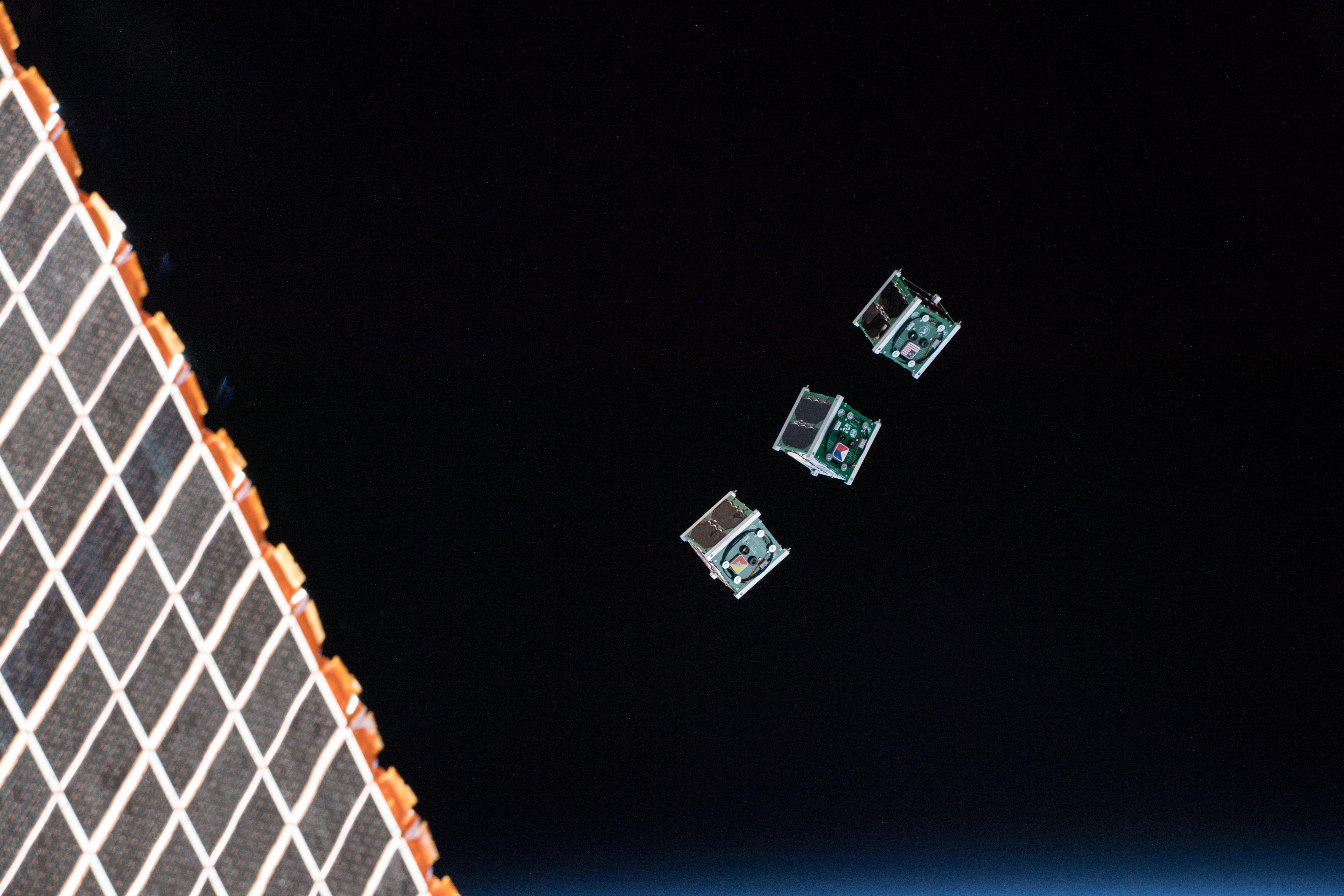 「きぼう」から放出されるブータン王国 ブータン王立大学超小型衛星「BHUTAN-1」/フィリピン共和国 フィリピン大学ディリマン校超小型衛星「MAYA-1」/マレーシア マラ工科大学超小型衛星「UiTMSAT-1」の様子 / 撮影日:2018年8月10日(日本時間)(iss056e130494)