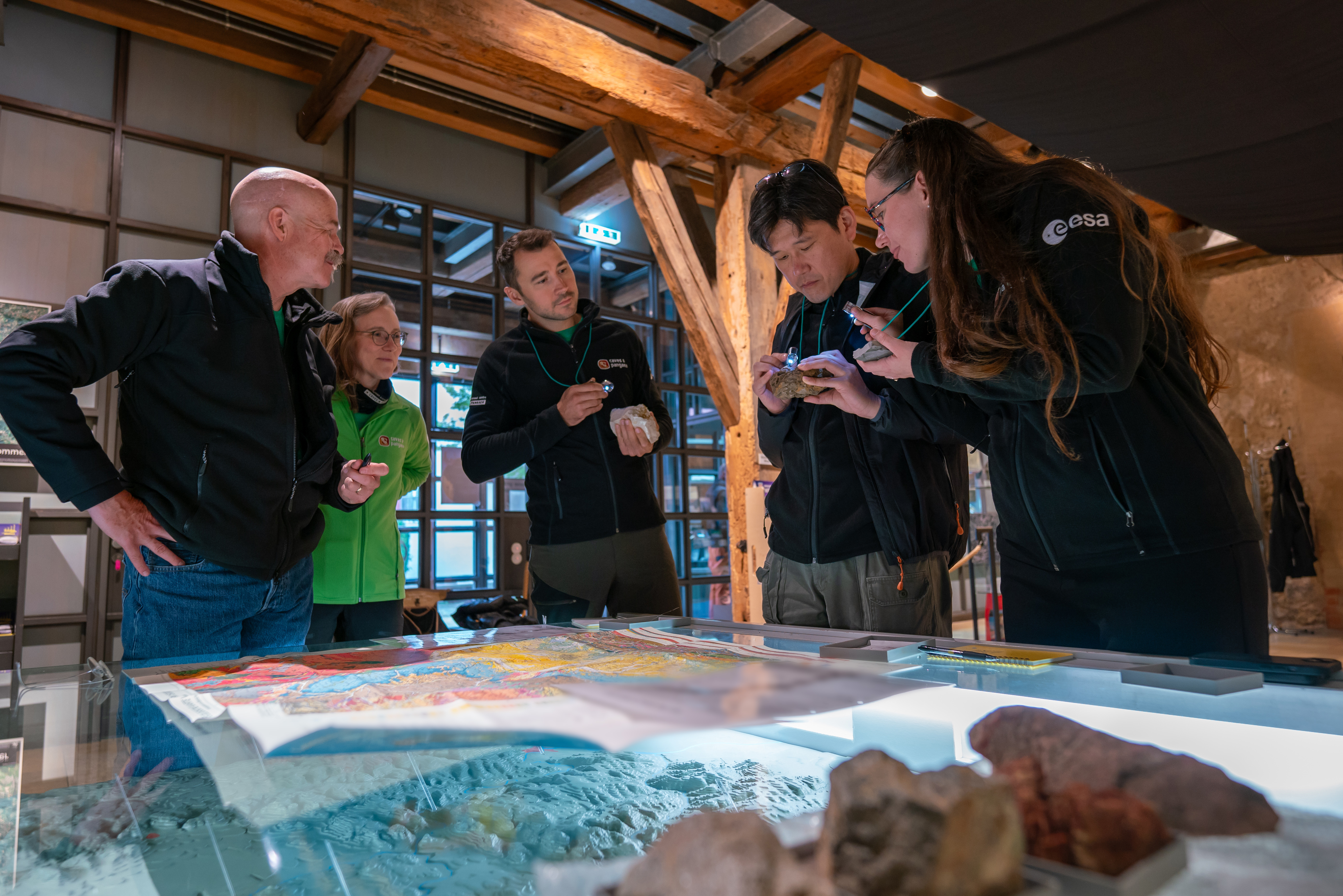 パンゲア(PANGAEA)訓練にて、リース クレーターの衝突前に存在した様々な種類の岩石を調べる金井宣茂宇宙飛行士ら / 欧州宇宙機関(ESA)が実施するパンゲア(Planetary ANalogue Geological and Astrobiological Exercise for Astronauts: PANGAEA)訓練 2週目 / ドイツ ネルトリンゲン / 撮影日:2024年9月16日(日本時間)
