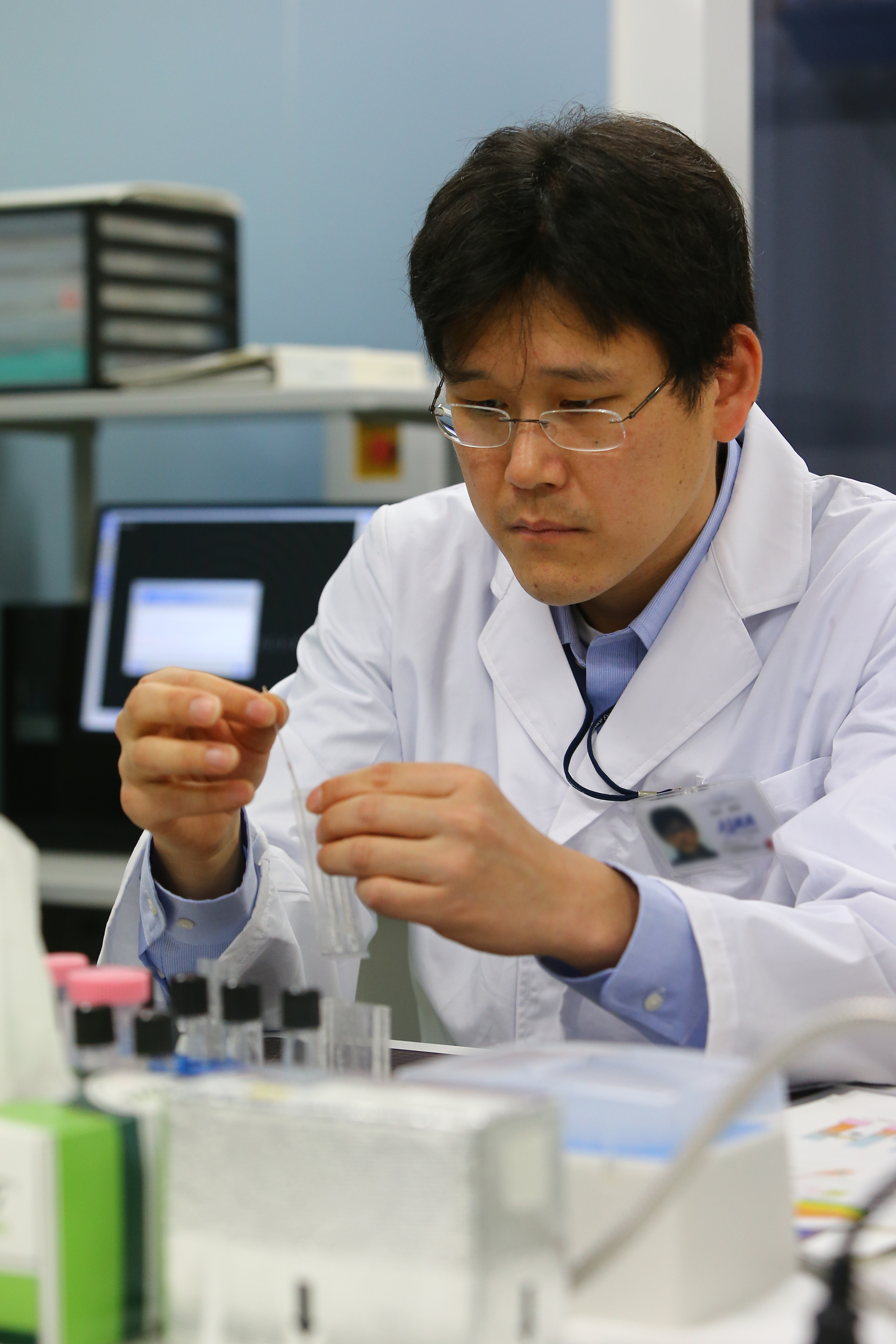 タンパク質結晶実験に関する訓練を行う金井宣茂宇宙飛行士 / 金井宣茂宇宙飛行士訓練公開時に撮影 / 筑波宇宙センター(TKSC) 宇宙実験棟 / 撮影日:2017年4月18日(日本時間)
