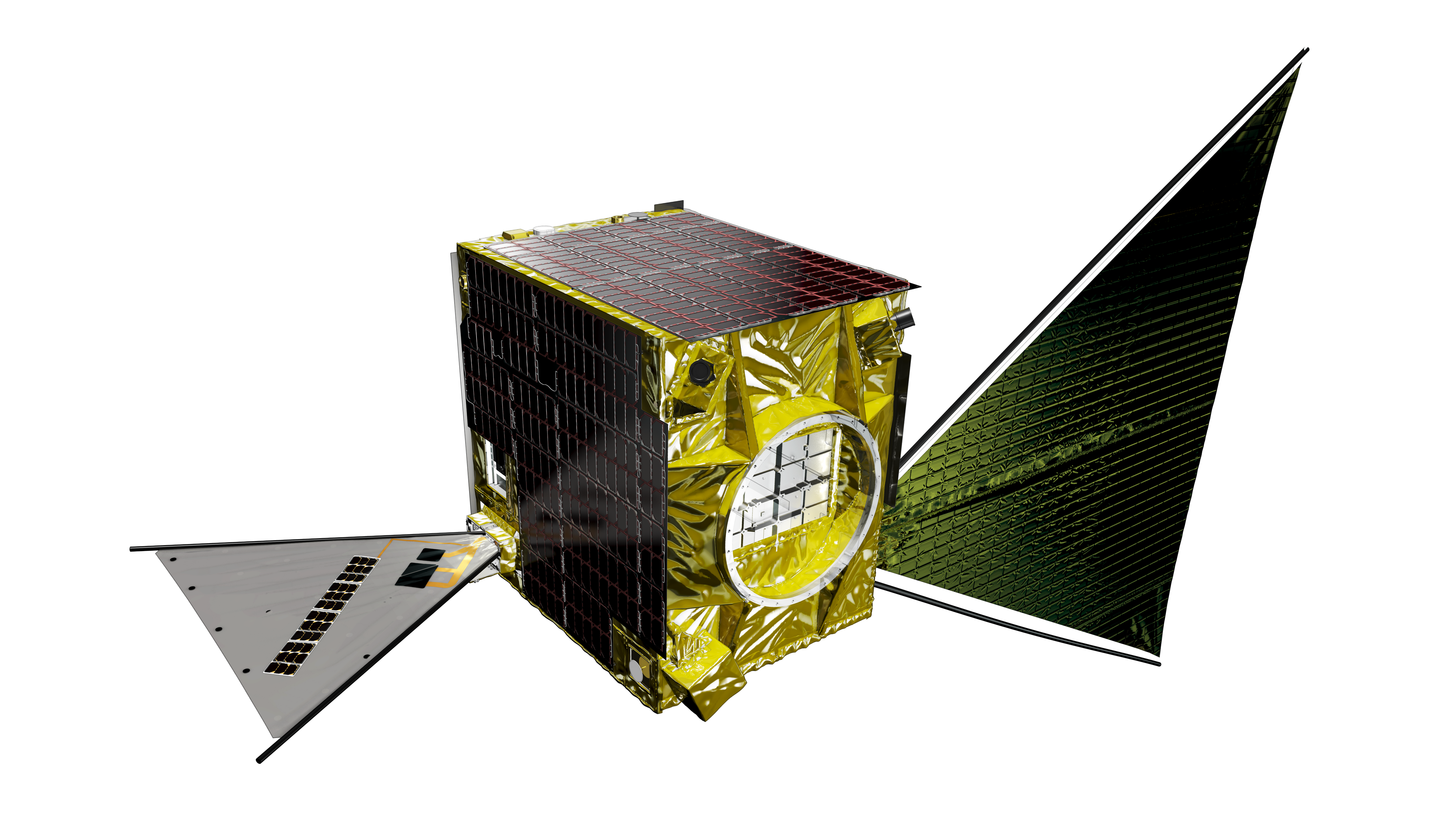 革新的衛星技術実証4号機の小型実証衛星4号機(RAISE-4)。 公募により選定された8つの部品・機器の実証テーマを搭載し、軌道上で実証テーマ機器の実験を行います。 <軌道上で展開物を展開した後の形態>