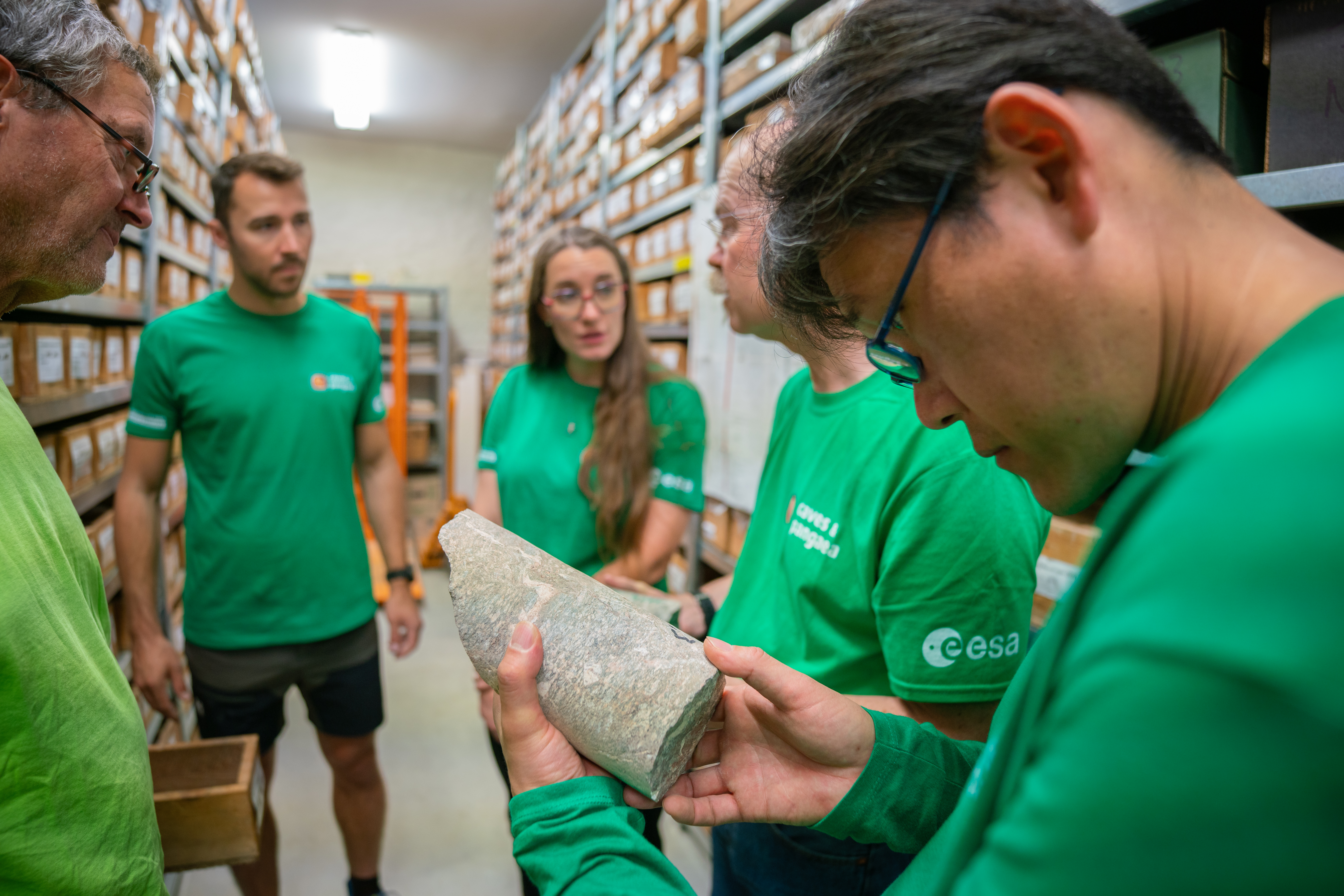 パンゲア(PANGAEA)訓練にて、リース クレーター博物館でネルトリンゲンから採取されたコアサンプルを観察する金井宣茂宇宙飛行士 / 欧州宇宙機関(ESA)が実施するパンゲア(Planetary ANalogue Geological and Astrobiological Exercise for Astronauts: PANGAEA)訓練 2週目 / ドイツ ネルトリンゲン / 撮影日:2024年9月19日(日本時間)