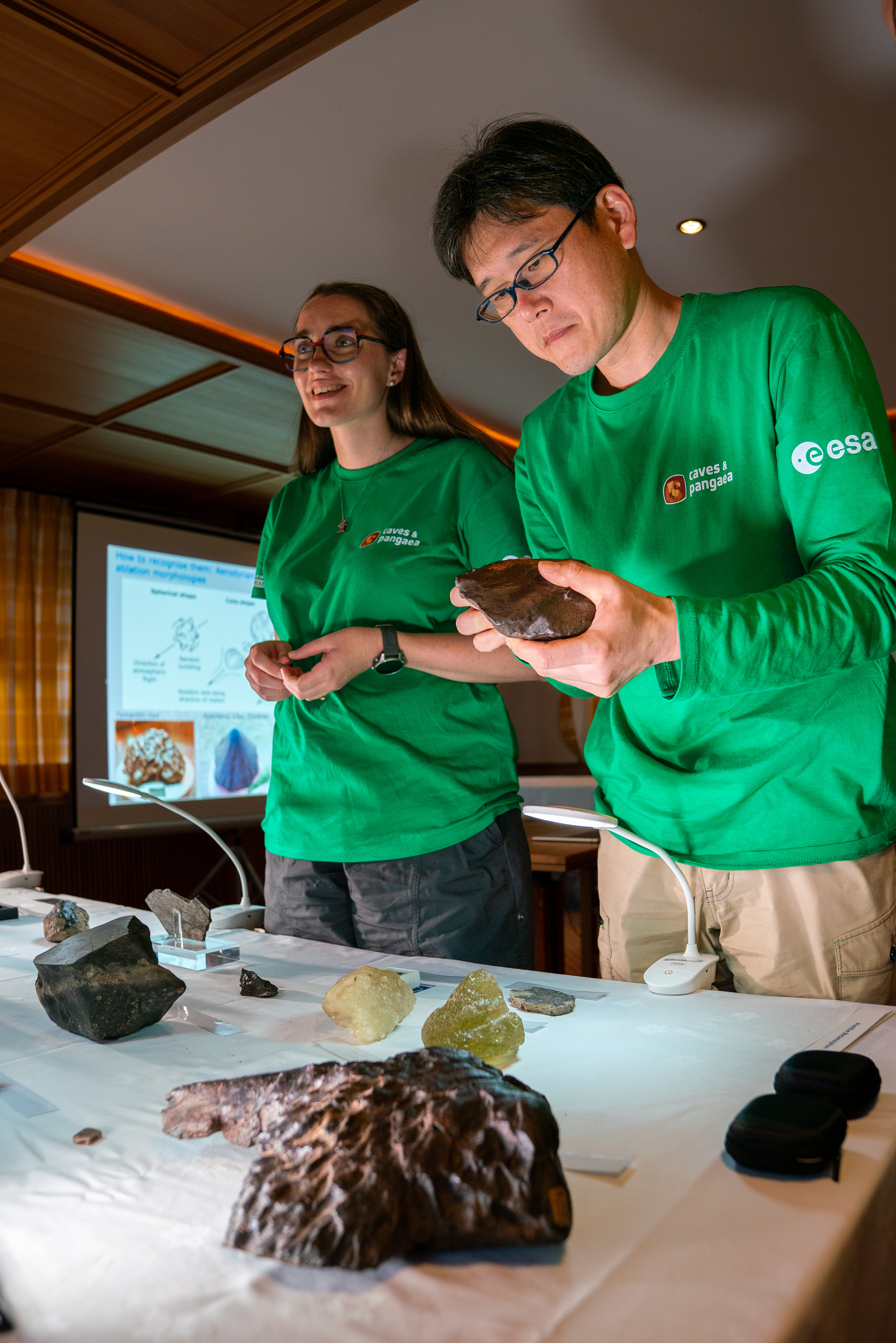 パンゲア(PANGAEA)訓練にて、珍しい隕石の破片を観察する金井宣茂宇宙飛行士ら / 欧州宇宙機関(ESA)が実施するパンゲア(Planetary ANalogue Geological and Astrobiological Exercise for Astronauts: PANGAEA)訓練 1週目 / イタリア ブレッターバッハ / 撮影日:2024年9月12日(日本時間)