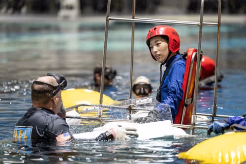 水上サバイバル訓練を行う米田あゆ宇宙飛行士 / ASCAN 2025 Class Water Survival Training / NASAジョンソン宇宙センター(JSC) 無重量環境訓練施設(Neutral Buoyancy Laboratory: NBL) / 撮影日:2026年2月13日(日本時間)(jsc2026e007172)