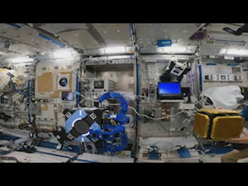 Astrobeeのテンタクル動作テストを行う大西、ペティット両宇宙飛行士