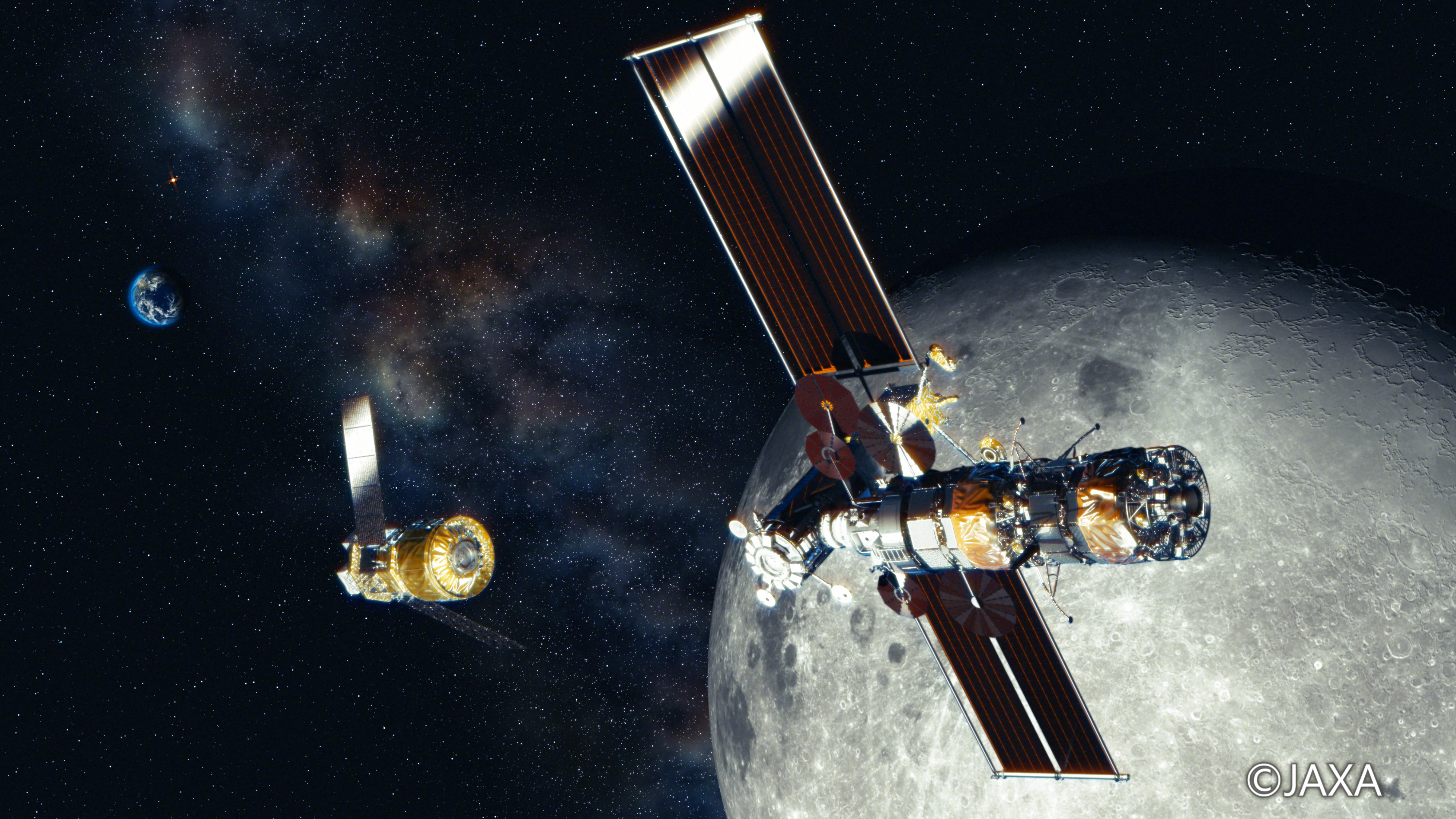 フェーズ1のゲートウェイ(Gateway)とゲートウェイ補給機(火星、地球、月を含む) (※補給機の画像はHTV-Xのものです。) / 旧管理番号:P100012720 / https://www.exploration.jaxa.jp/ / 制作日:2019年11月27日(日本時間)