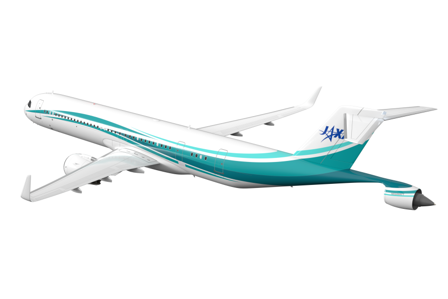 胴体後部に電動ファンを有する電動ハイブリット推進システムを搭載した旅客機のイメージ図電動ファンを双発から単発の形態にしたバージョン