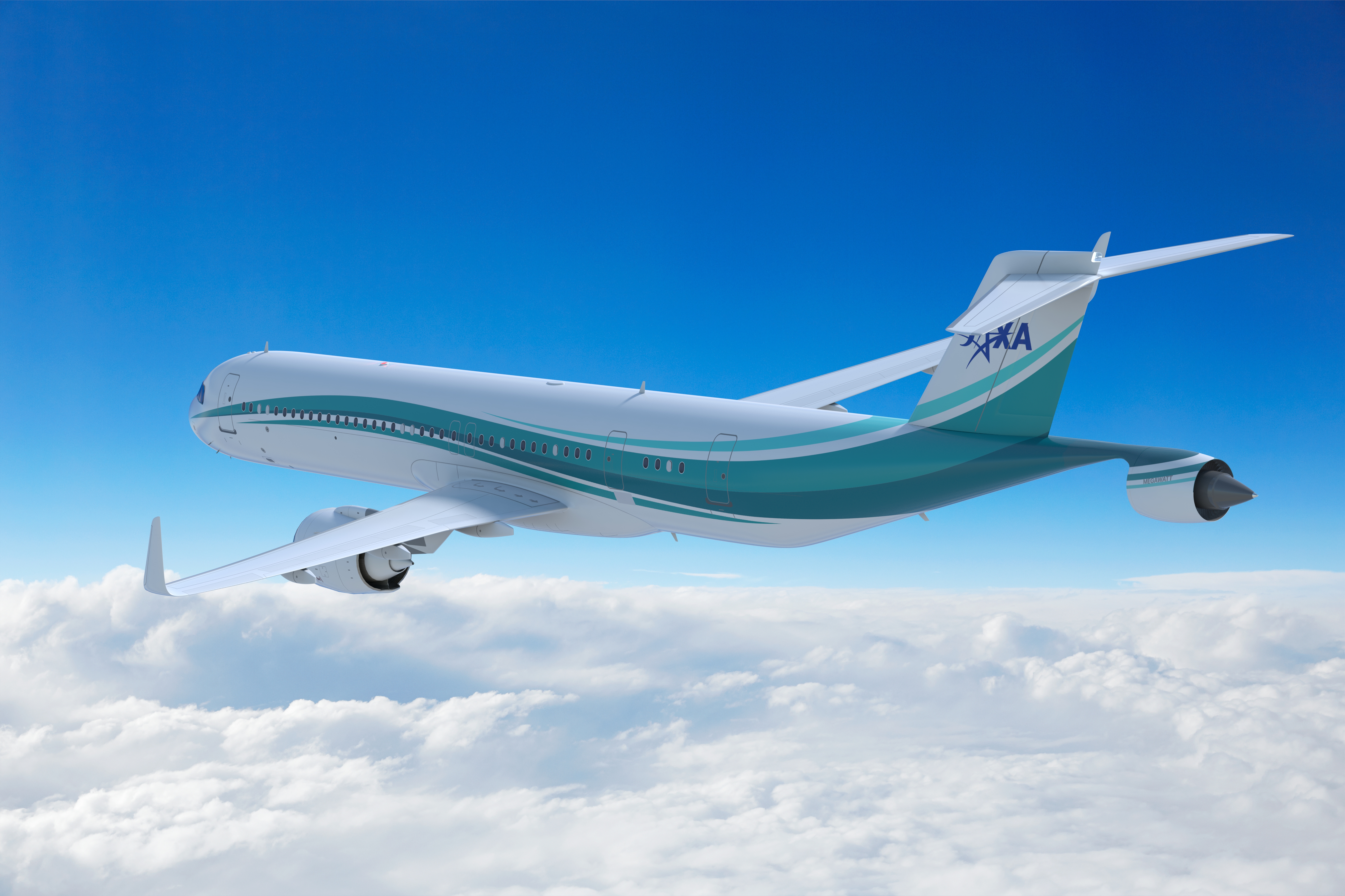 胴体後部に電動ファンを有する電動ハイブリット推進システムを搭載した旅客機のイメージ図電動ファンを双発から単発の形態にしたバージョン