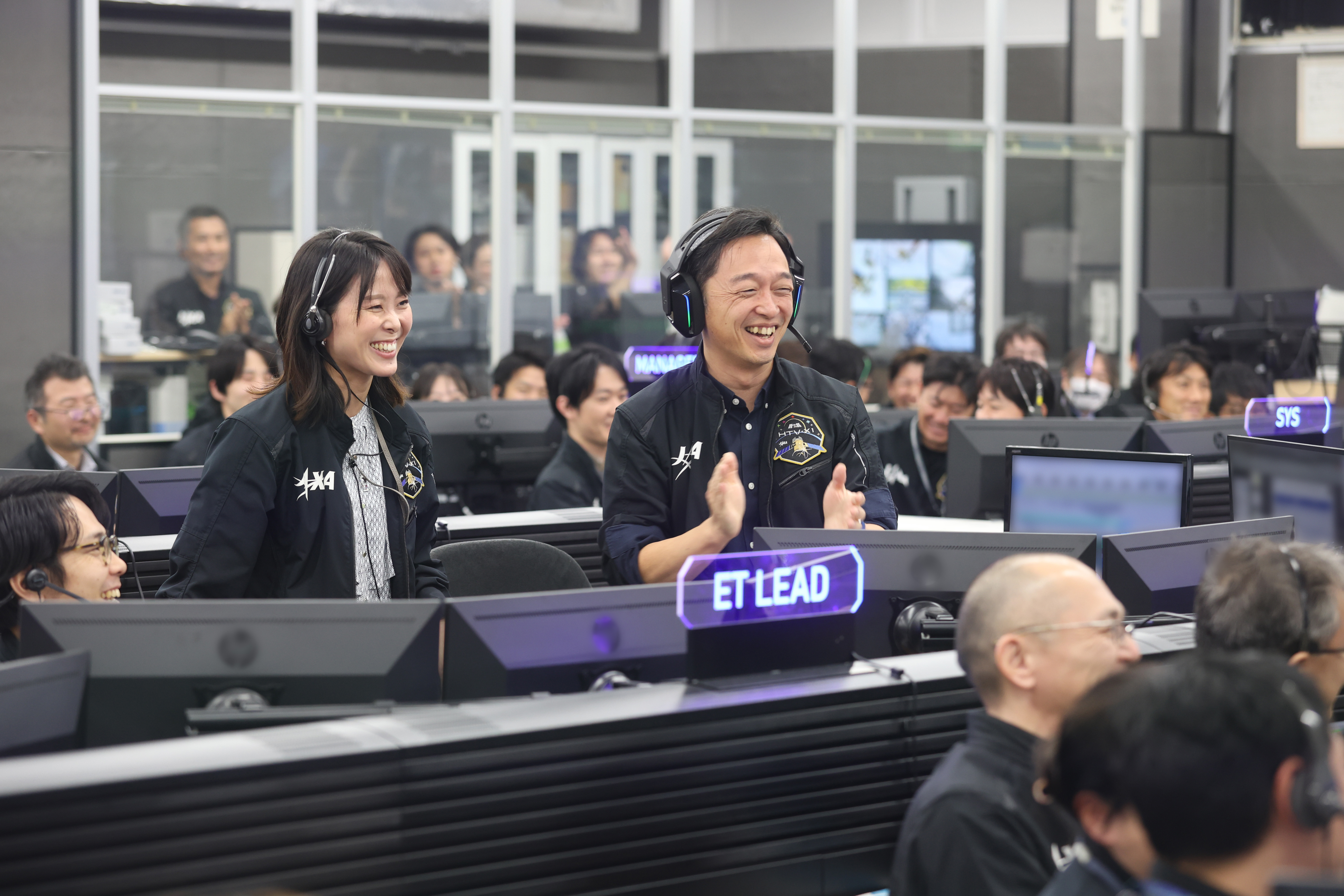 HTV-X1号機の把持成功を喜ぶHTV-X運用管制室の様子