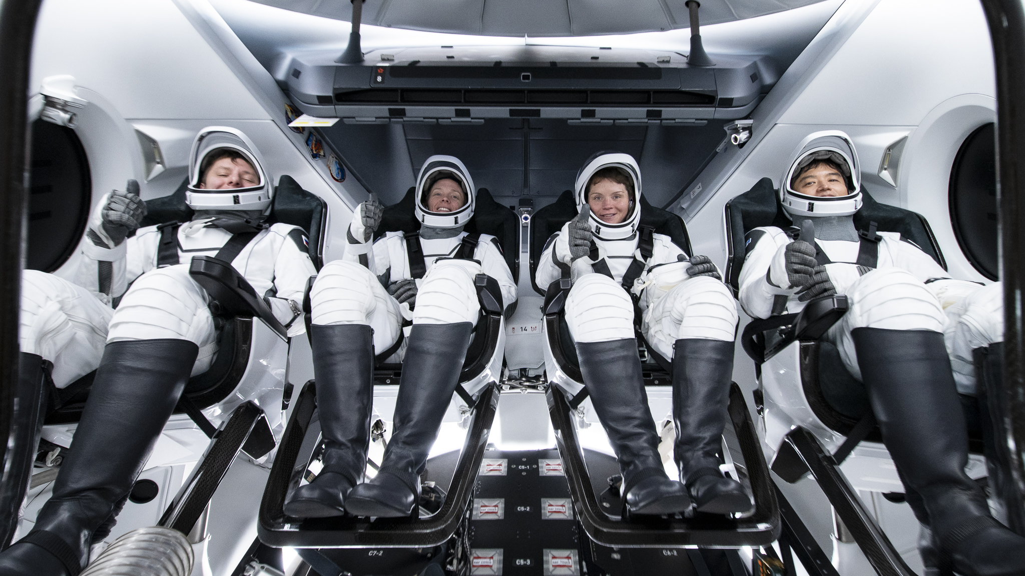打上げ前のリハーサルを行う大西卓哉宇宙飛行士らクルードラゴン宇宙船運用10号機(SpaceX Crew-10)クルー / クルードラゴン宇宙船運用10号機(SpaceX Crew-10)クルー:アン・マクレイン、ニコル・エアーズ、大西卓哉、キリル・ペスコフ宇宙飛行士 / NASAケネディ宇宙センター(KSC) / 撮影日:2025年3月10日(日本時間)(KSC-20250309-PH-SPX01_0005)