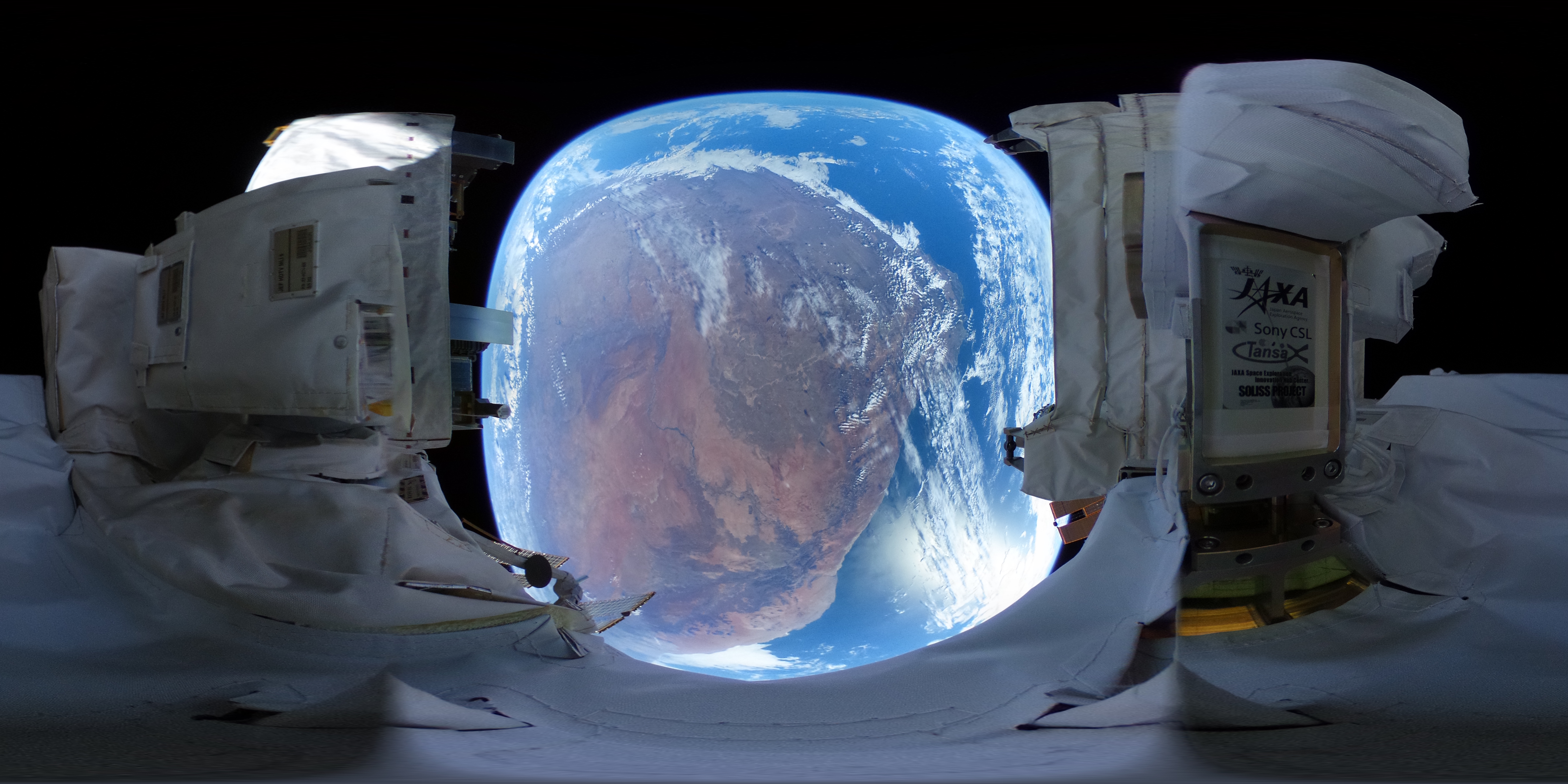 中型曝露実験アダプター(IVA-replaceable Small Exposed Experiment Platform: i-SEEP)に設置された小型衛星光通信実験装置(Small Optical Link for International Space Station: SOLISS)のモニタカメラ(360度カメラ「RICOH THETA」)から撮影された地球の様子 撮影:南アフリカ上空