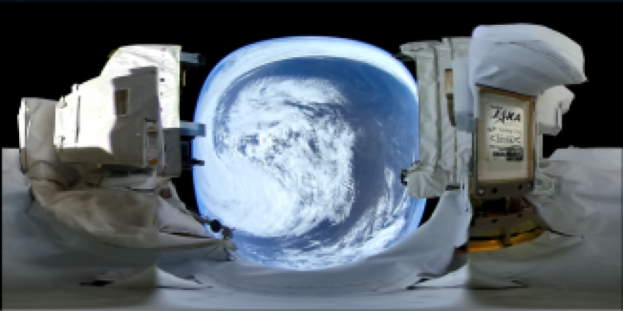 中型曝露実験アダプター(IVA-replaceable Small Exposed Experiment Platform: i-SEEP)に設置された小型衛星光通信実験装置(Small Optical Link for International Space Station: SOLISS)のモニタカメラ(360度カメラ「RICOH THETA」)から撮影された地球の様子