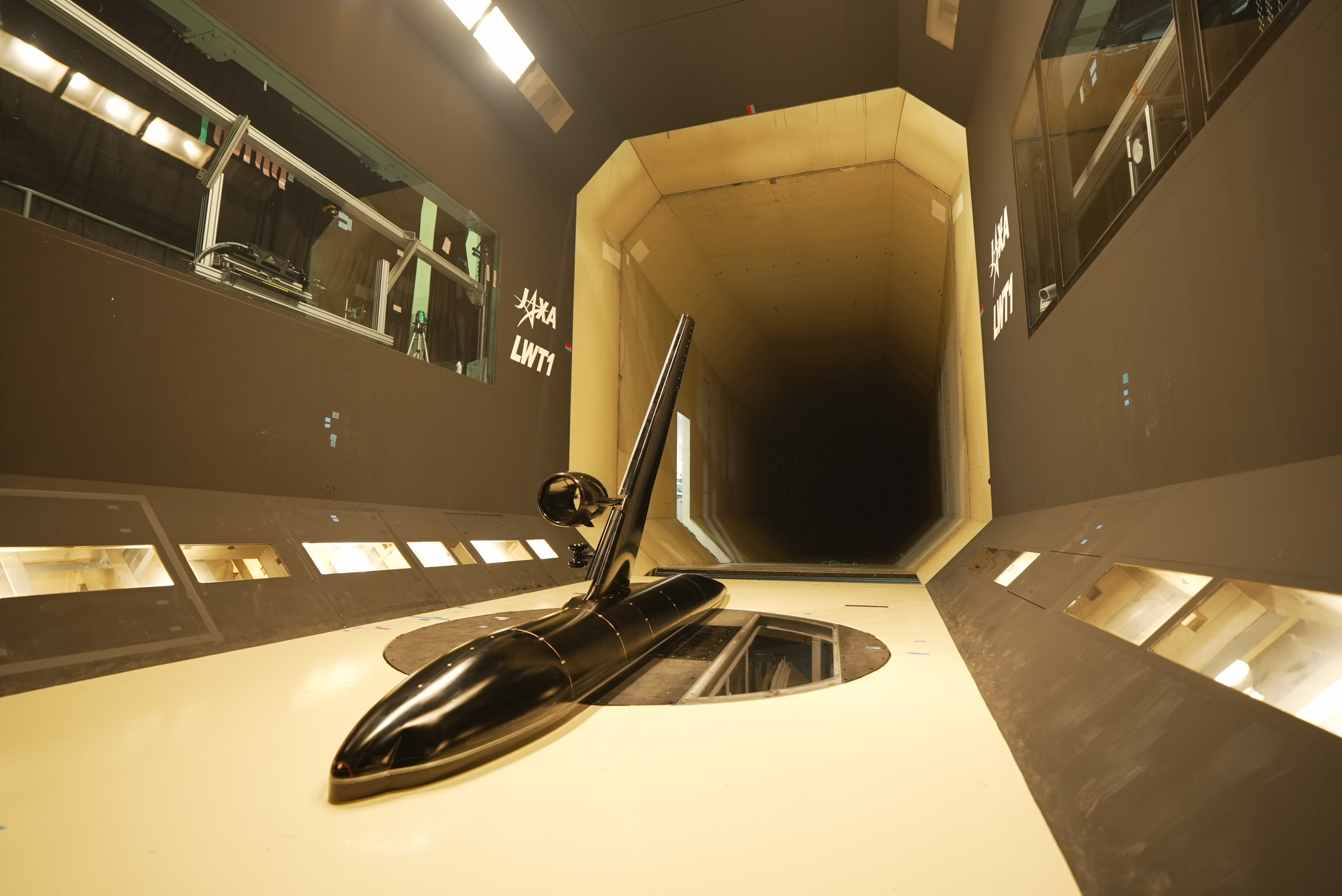 レーザシート光を用いた、JAXA最大級のCRM-HL 8%半裁模型まわりの流れの可視化風洞試験