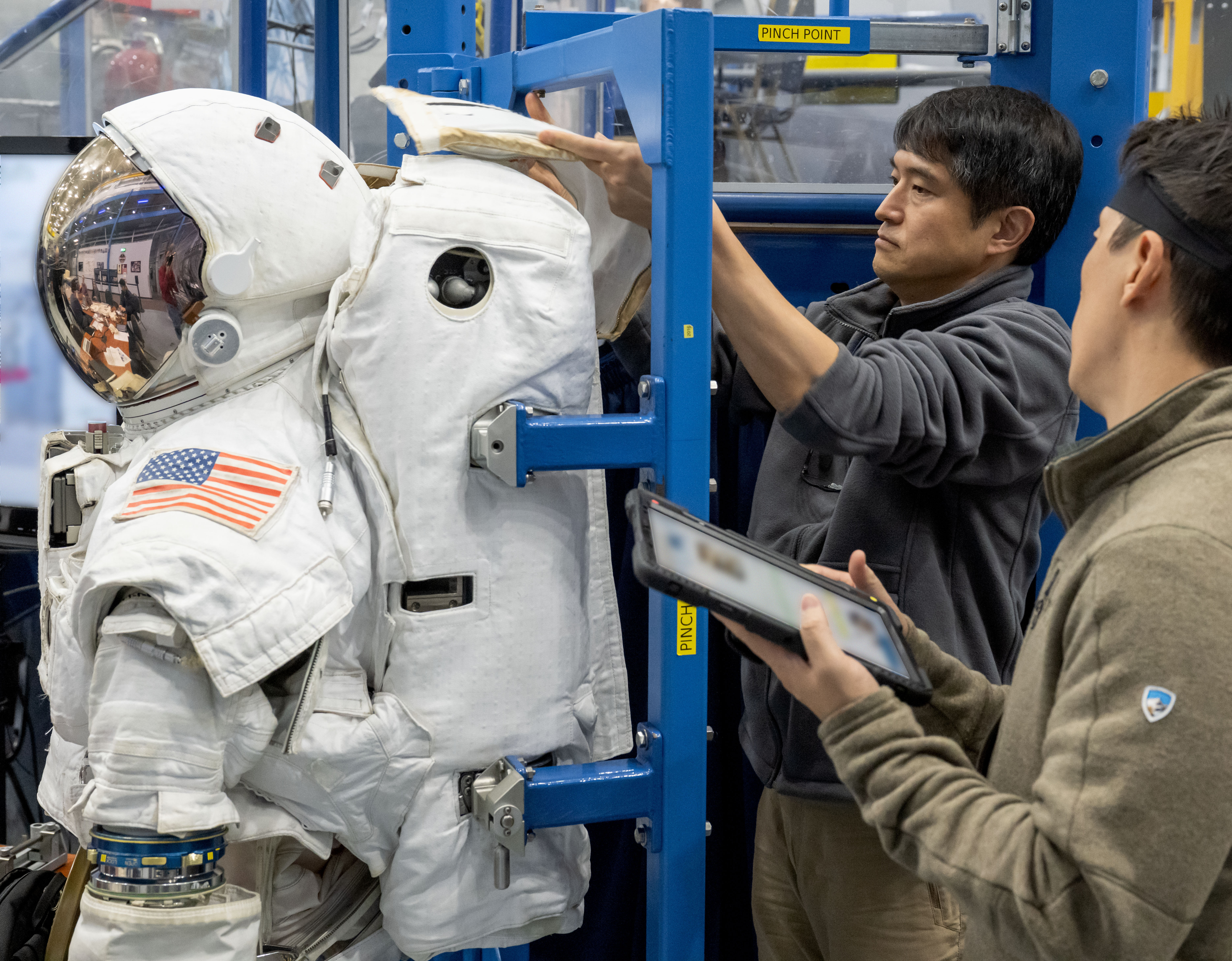 船外活動ユニット(Extravehicular Mobility Unit: EMU)の修復に関する訓練を行う大西卓哉、ジョニー・キム両宇宙飛行士 / NASAジョンソン宇宙センター(JSC) / 撮影日:2024年12月13日(日本時間)(jsc2024e080381)